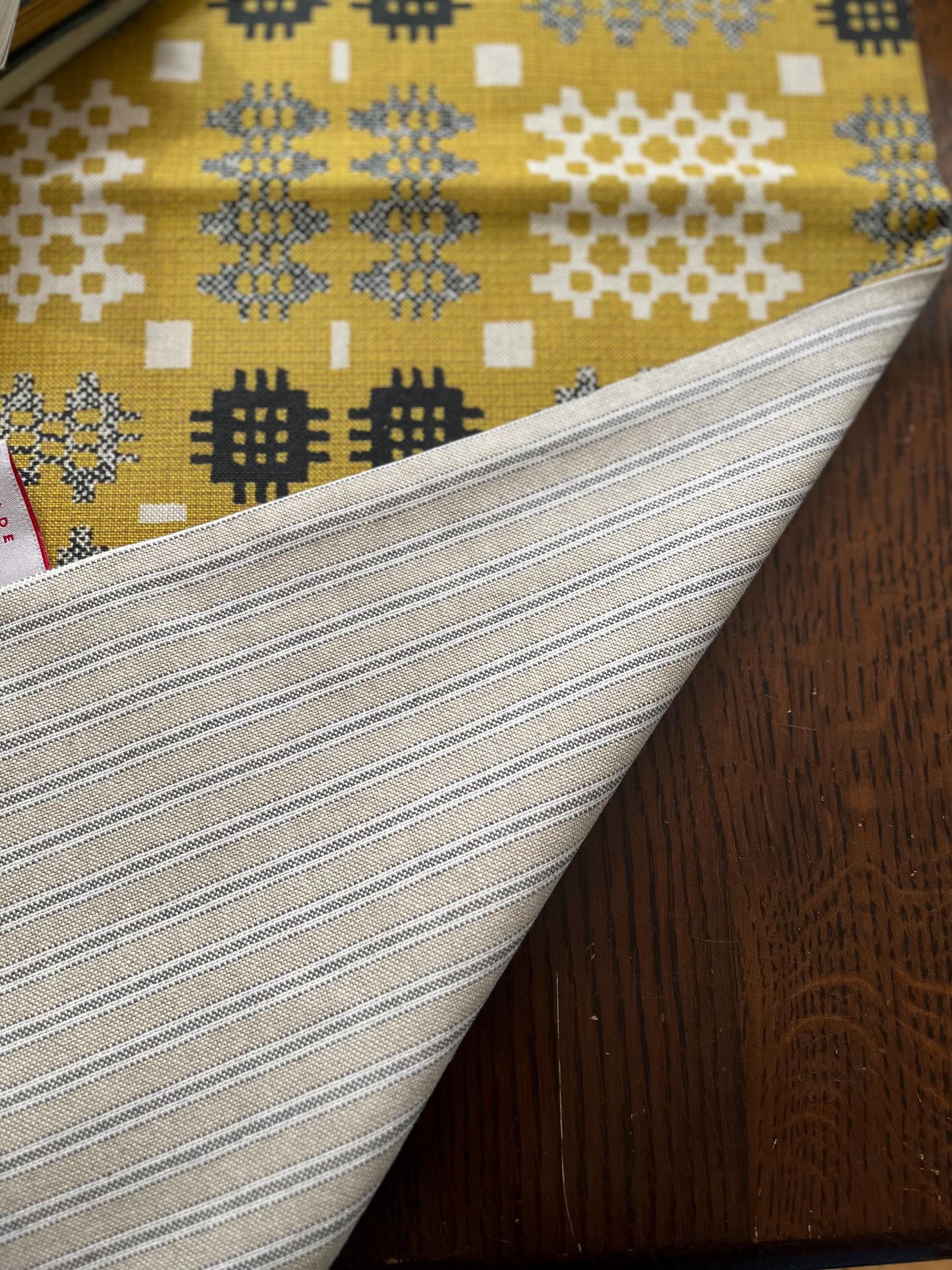 The runner is made in a Welsh tapestry print cotton mix fabric and a striped cotton ticking on the reverse.